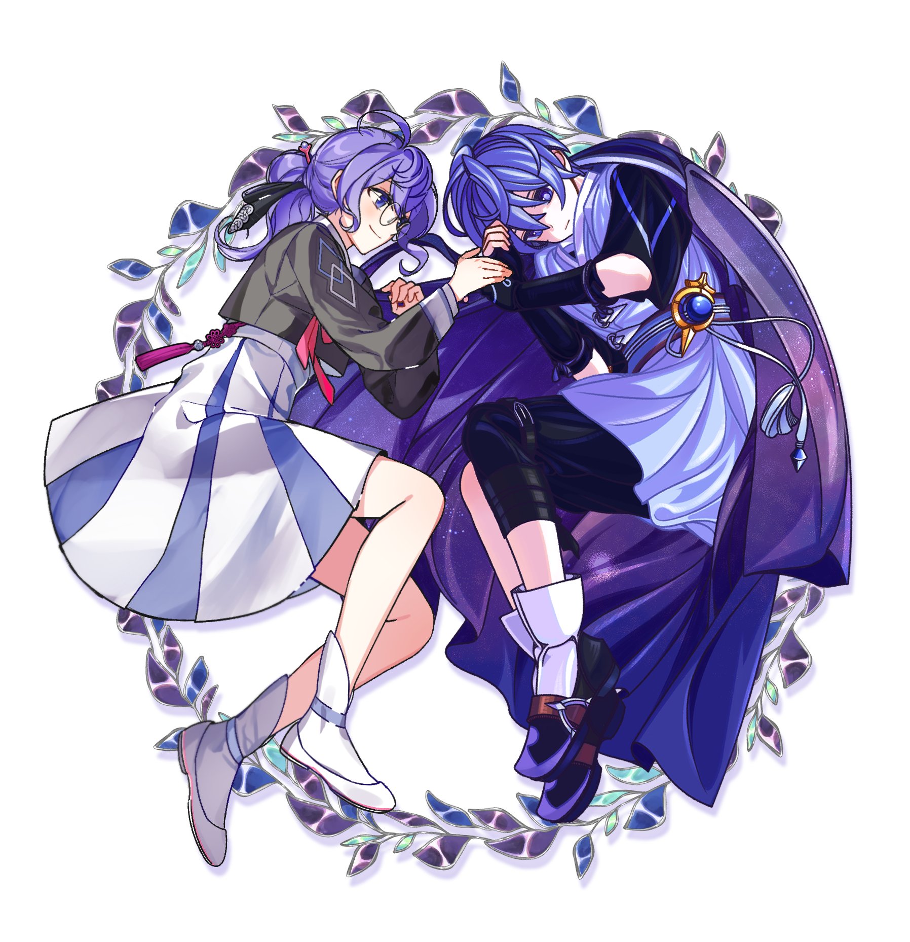 1boy1girladapted costumeahogealternate costumeblack jeogoriblack shoesblue eyesblue haircapeclosed mouthfetal positionfingerless glovesgarter beltglassesgloveslong sleeveslooking at anotherlyingon groundon sideponytailpurple hairribbonshoesshu pernovaskirtsockswhite skirtwhite socksyuria landar