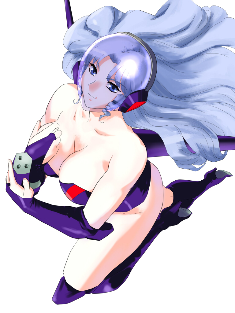 1girlblue eyesblue hairbootsbreastsbridal gauntletscleavagedrill hairfemale focusflight helmethelmethigh heelslarge breastslong hairmatching hair/eyessee-through clothesshoessimple backgroundsmilesolothigh bootsthighhighswhite backgroundwind