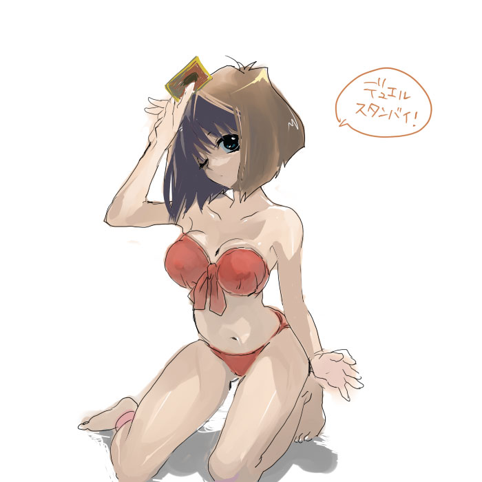 1girlbarefootbikiniblue eyesbrown haircardfemale focusholdingholding cardkneelingone eye closedshort hairsketchsoloswimsuitwink