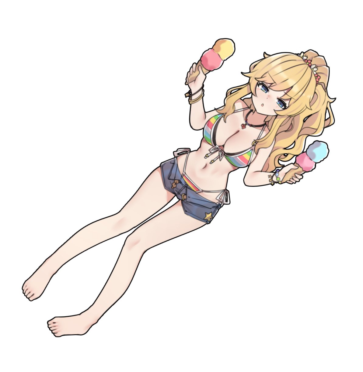 1girlbare shouldersbarefootbikiniblonde hairblue eyesbreastscleavagecollarbonedenimdenim shortsfoodfront-tie bikini topfront-tie topholdingholding foodholding ice creamice creamjewelrylarge breastslong hairlooking at viewernavelnecklaceponytailrainbow bikinishortsside-tie bikini bottomsoloswimsuitthighswavy hairwavy sidelockswristband