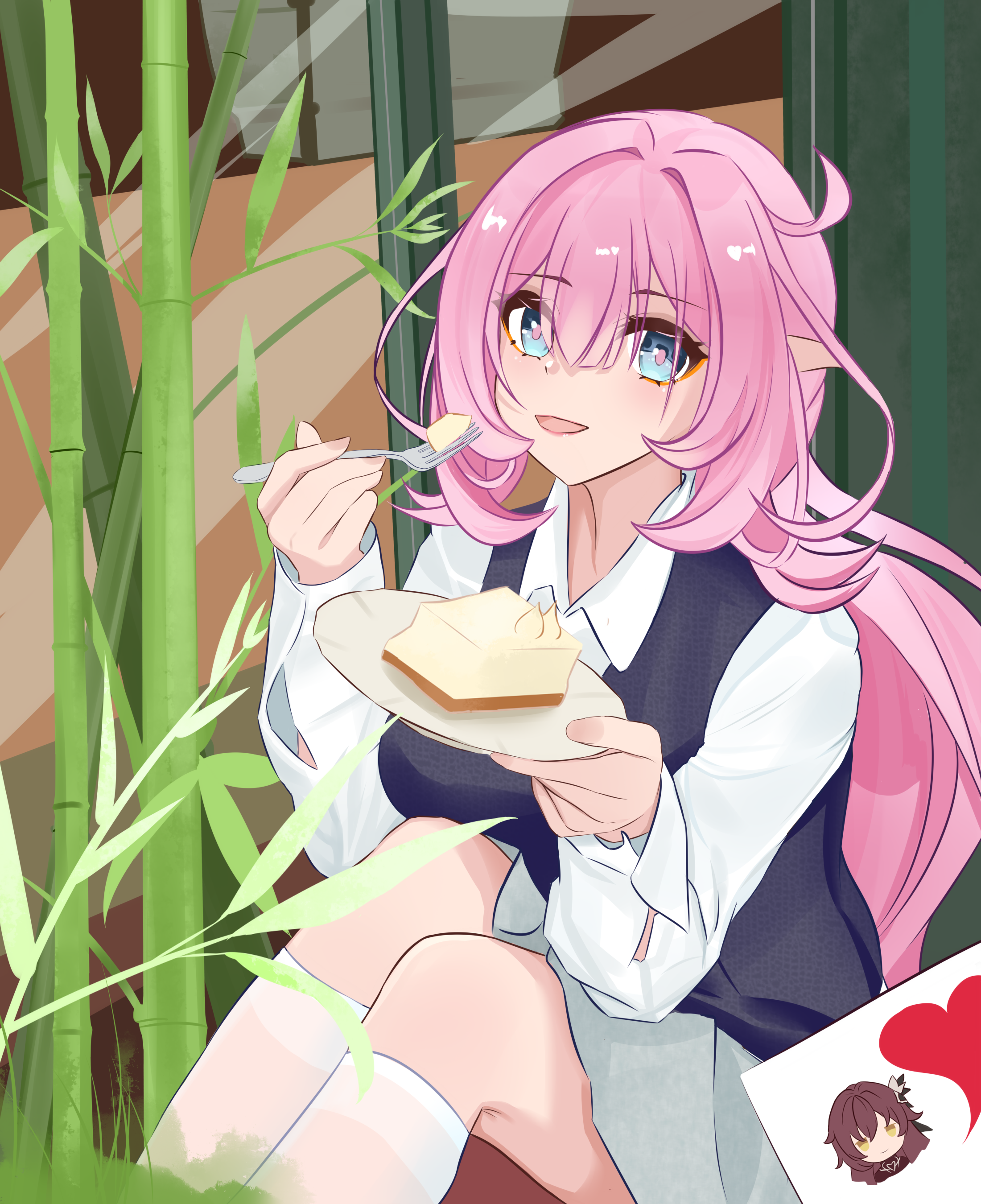 1girlalternate costumebambooblue cardiganblue eyesbreastscakecake slicecardiganelffoodforkgrey skirtholdingholding forkholding platelarge breastslong hairlooking at vieweropen mouthpaperpink hairplatepointy earsschool uniformshirtsittingskirtsockssolovery long hairwhite shirtwhite socks