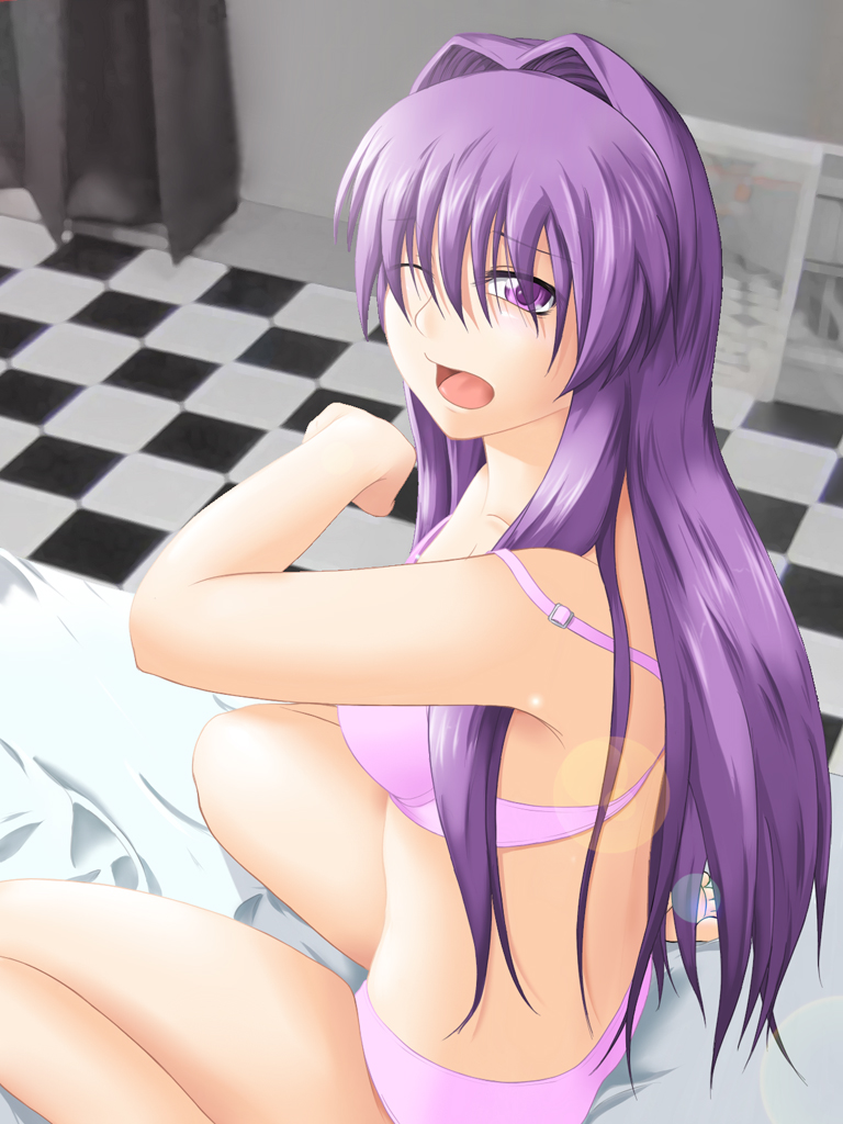 eve (black cat), black cat (series), eyebrows, 00s, 1girl, ass, blonde hair, female focus, from behind, leaning forward, loli, long hair, looking at viewer, looking back, nude, purple eyes, solo, very long hair