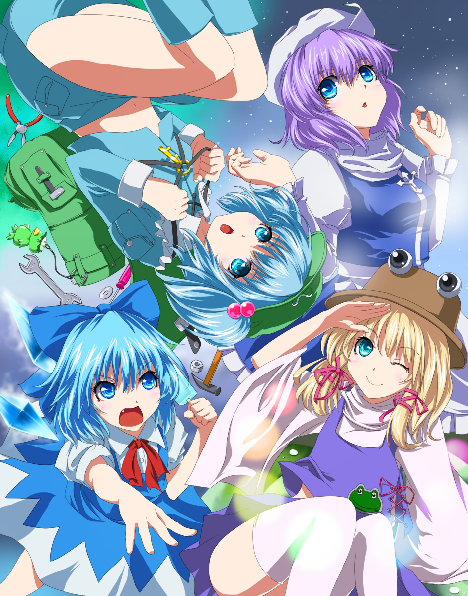4girlsangrybackpackbagblonde hairblue eyesblue hairclaw hammerfangfemale focusfoodfroghair ribbonhammerhatice creamkeymultiple girlsnut (hardware)one eye closedpurple hairrandoseruribbonsalutescrewdrivershort hairthighhighstoolstwo side upwhite thighhighswink