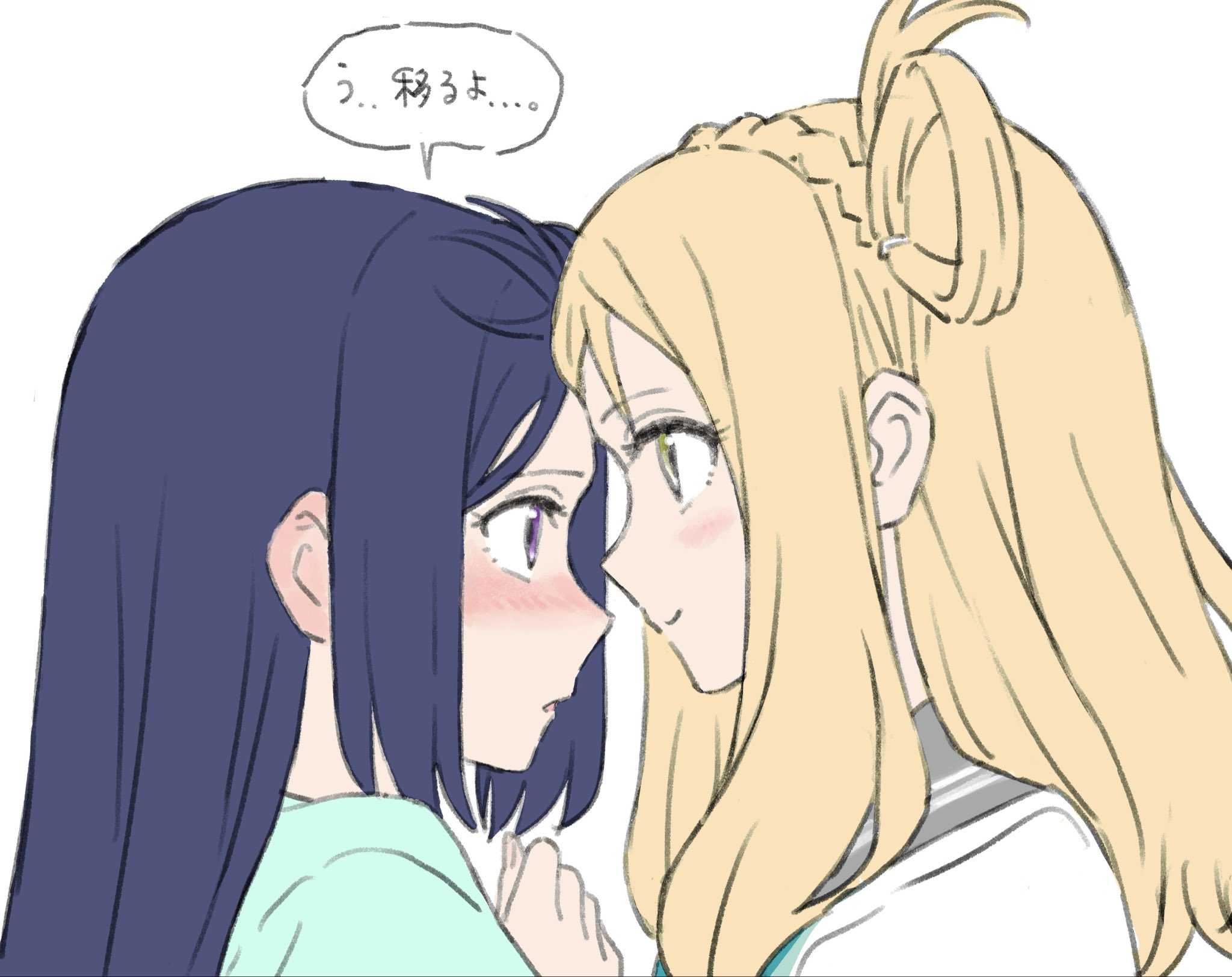 2girlsaqua neckerchiefblonde hairblue hairblushbraidclosed mouthcrown braidface-to-facegrey sailor collarhair ringslong hairlooking at anothermultiple girlsneckerchiefnose blushparted lipsportraitpurple eyessailor collarschool uniformserafukushirtsingle hair ringspeech bubblesummer uniformuranohoshi school uniformwhite shirtyellow eyesyuri