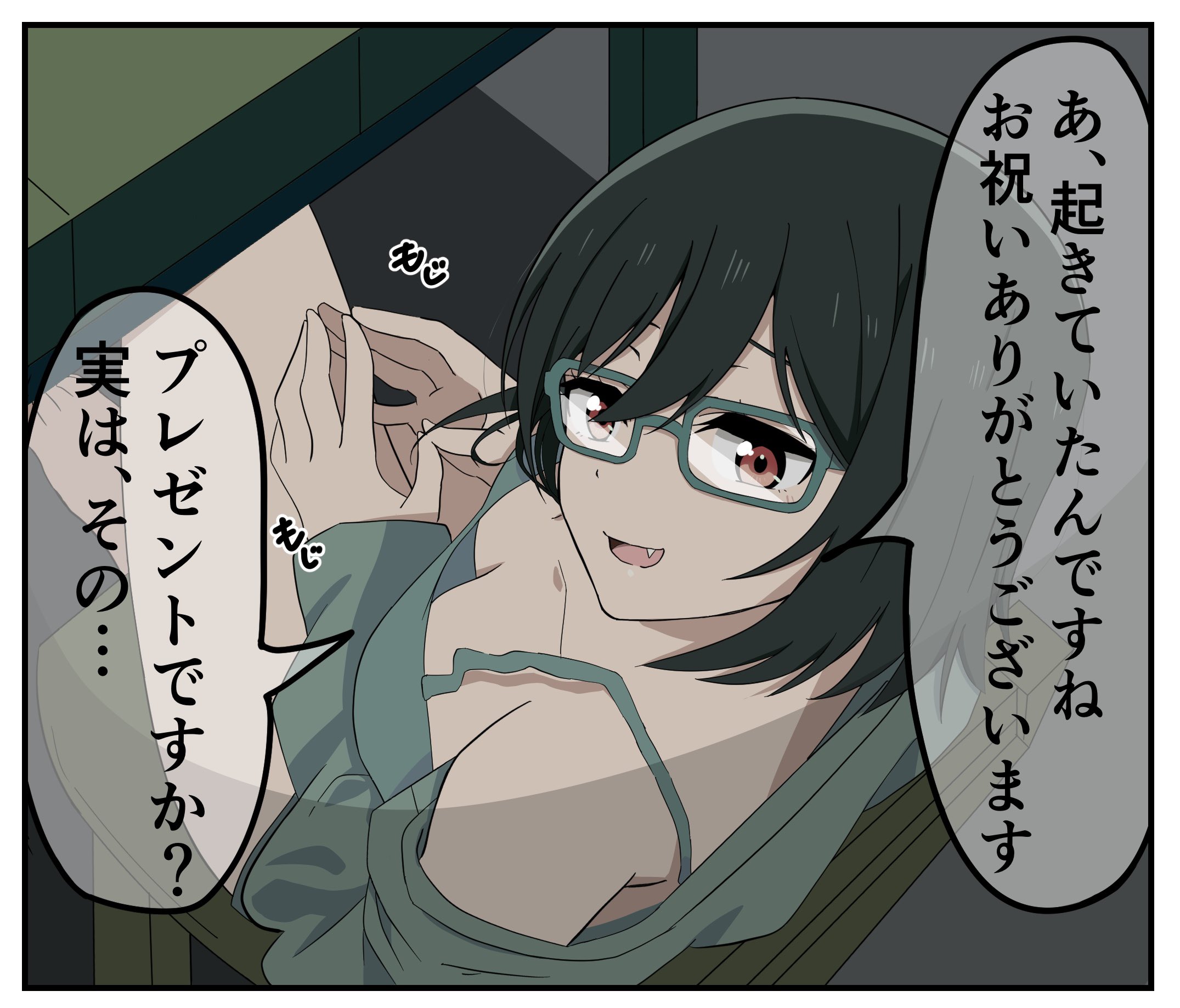 1girlblack hairbob cutbordercardigandownblousefangfrom aboveglassesgreen cardigangreen-framed eyewearlong sleeveslooking at viewermedium hairoff shoulderofficial alternate costumeopen mouthorange eyessittingsolosound effectswhite border