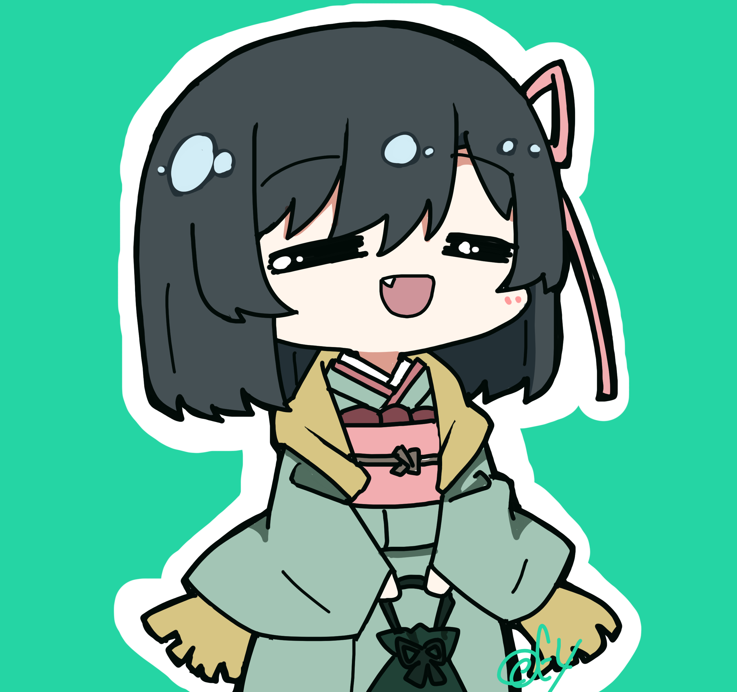 :d1boy1girlbagblack hairclosed eyesdrawstringdrawstring bagfacing viewerfanggreen backgroundgreen kimonohair ribbonholdingholding bagjapanese clotheskimonolong hairlong sleevesmedium hairobiobiageobijimeopen mouthoutlinepink ribbonpink sashribbonsashsignaturesimple backgroundsmilesolowhite outlinewide sleevesyukata