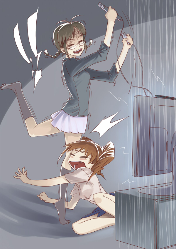 00s2girlsbrown hairgame consoleglassesmultiple girlsplaying gamesshort hairskirtsockstwintailsvideo gamewii