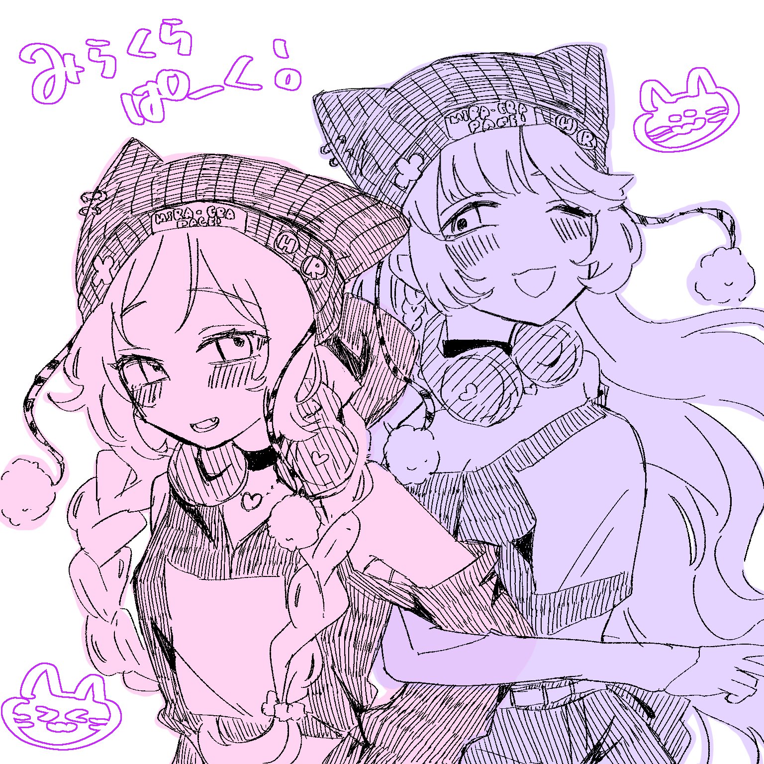 hrsw mz, aubrey (headspace) (omori), aubrey (omori), mr. plantegg (omori), omori, chinese commentary, commentary request, highres, + +, 1girl, :d, alternate costume, alternate hairstyle, bare shoulders, blush, bow, braid, bright pupils, buttons, clothing cutout, dot nose, double-parted bangs, dress, frilled dress, frilled sleeves, frills, from above, hair between eyes, hair bow, halftone, halftone background, heart, holding, holding stuffed toy, hugging object, long sleeves, low twin braids, neck ribbon, open mouth, outline, pink background, pink bow, pink ribbon, puffy long sleeves, puffy sleeves, purple eyes, purple hair, ribbon, shoulder cutout, simple background, smile, solo, sparkle, stuffed eggplant, stuffed toy, twin braids, two-tone background, upper body, white background, white dress, white outline, white pupils