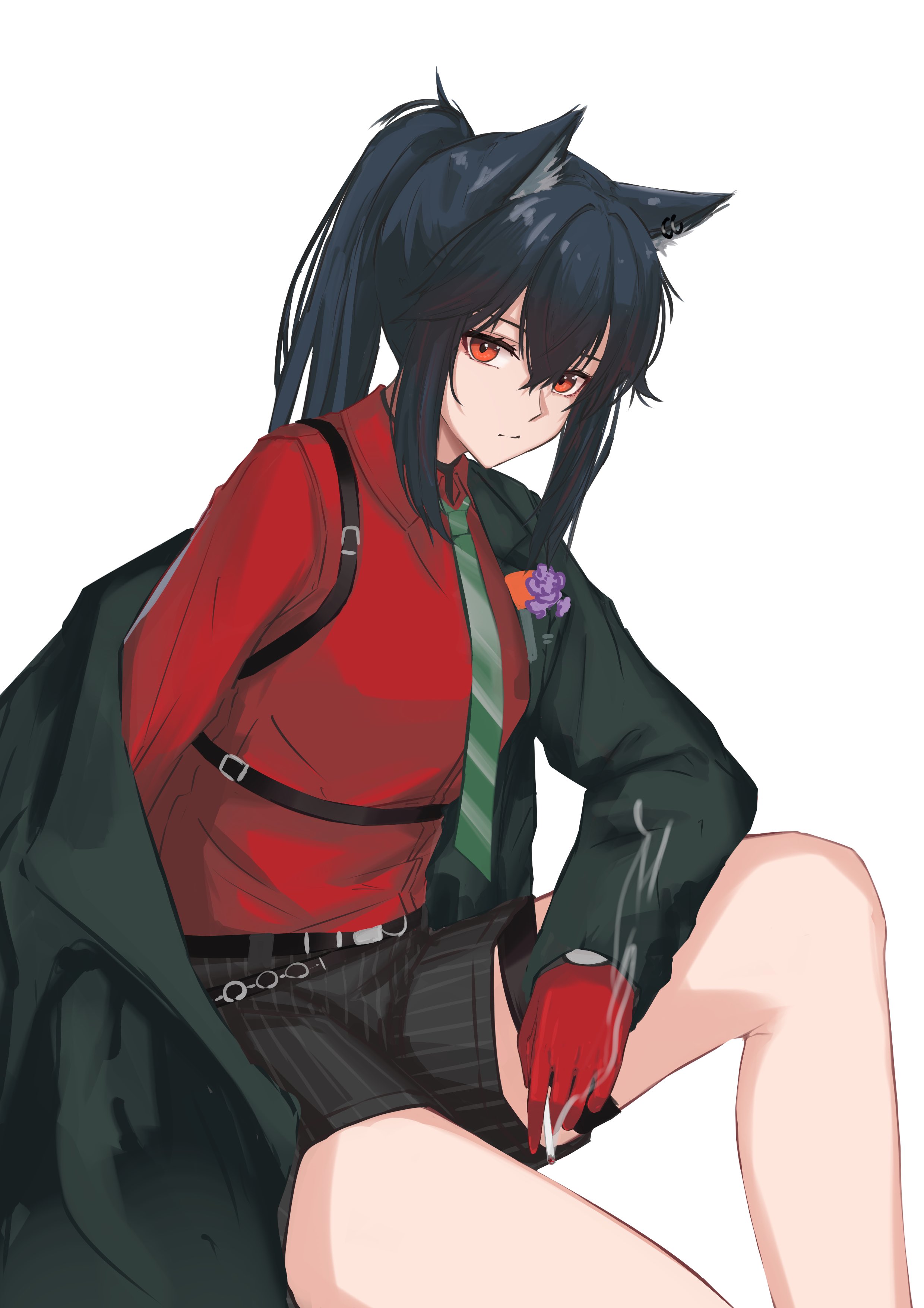 1girlanimal ear fluffanimal earsbeltblack beltblack coatblack hairblack shoescigarettecoatcollared shirtglovesgreen necktieholdingholding cigarettelong hairlong sleeveslooking at viewernecktieofficial alternate costumeofficial alternate hairstyleorange eyespantspinstripe pantspinstripe patternponytailred glovesred shirtshirtshoessidelockssimple backgroundsingle off shouldersmokesolowhite backgroundwolf earswolf girl