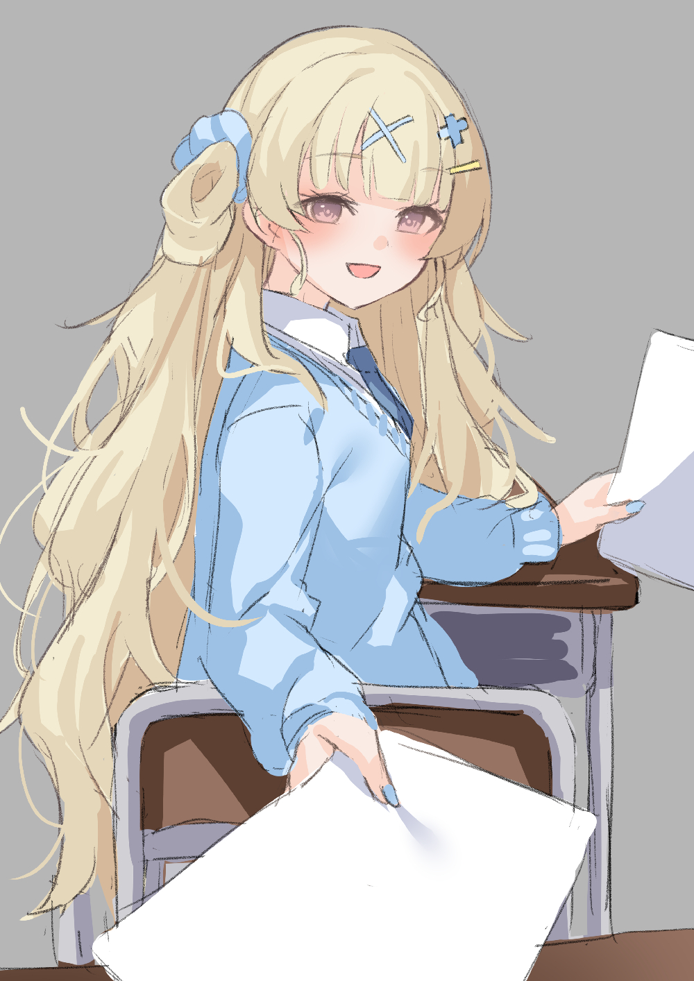 :d1girlalternate costumeblonde hairblue cardiganblue nailsblue necktieblushcardigandeskfrom sidegrey backgroundhair ornamentholdingholding paperlong hairlong sleeveslooking at viewerlooking to the sidenail polishnecktieopen mouthpaperpurple eyesschool deskschool uniformsimple backgroundsmilesolovery long hairx hair ornament