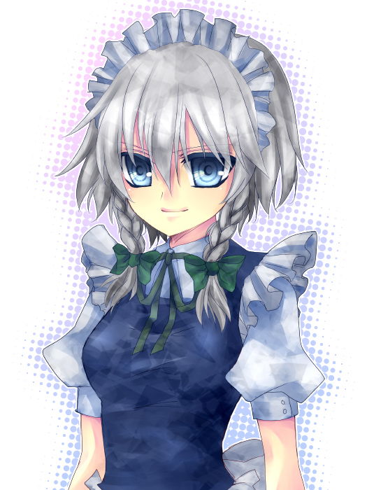 1girlblue eyesbraidbreastsfemale focushair ribbonhalftonehalftone backgroundmaidribbonsolotwin braidsupper bodywhite background