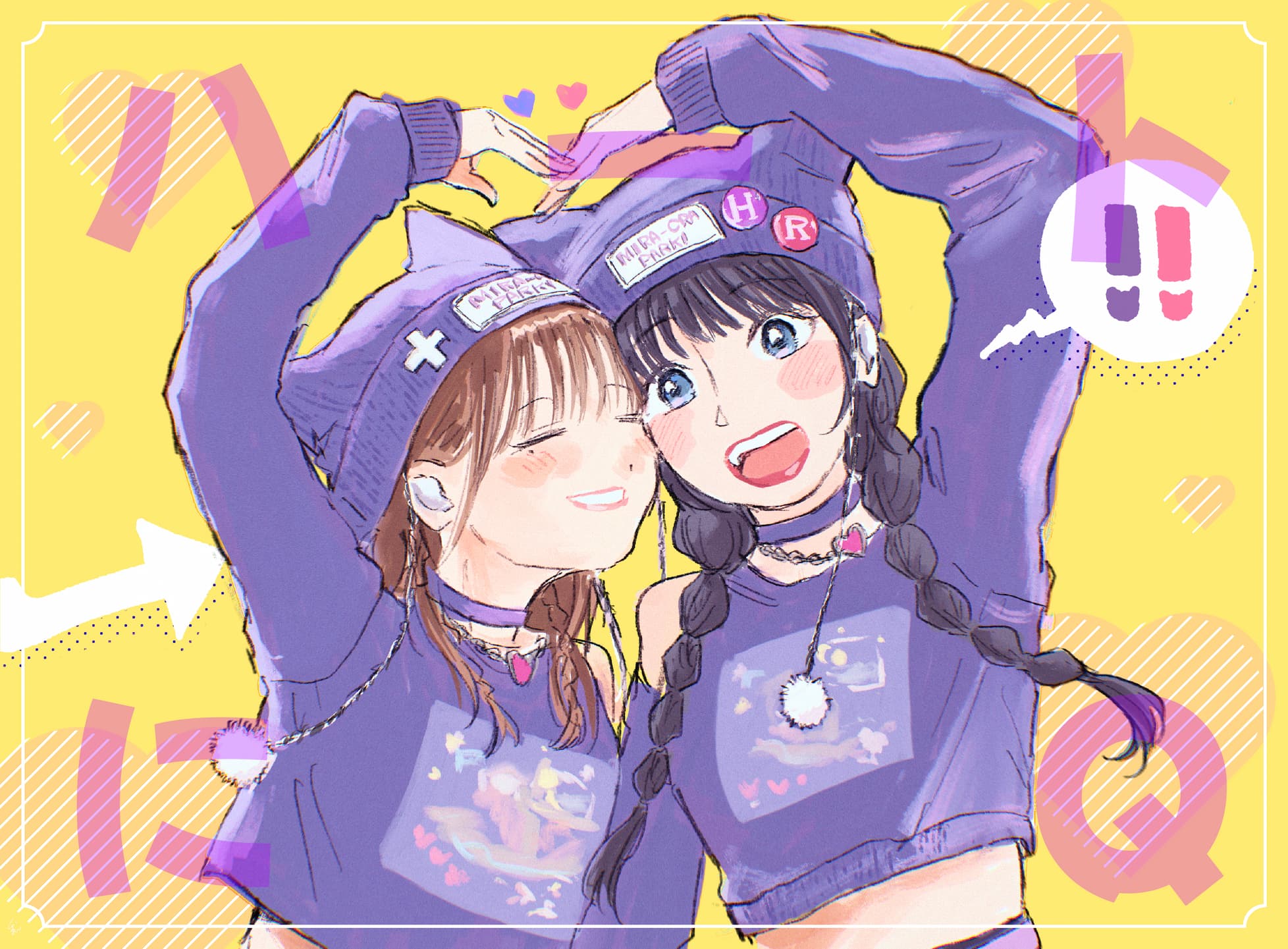 1boy2girls5th live tour ~4pair power spread!!!!~animificationarm upbare shouldersbeanieblack hairblue eyesblushbraidbrown haircheek-to-cheekchokerclothing cutouthatheads togetherheart armsheart arms duoheart ni q (love live!)in-ear earphoneskurusu rinlong sleeveslow twin braidsmira-cra park!multiple girlsnyao signyalofficial alternate costumeopen mouthpurple chokerpurple hatpurple shirtshirtshoulder cutoutsleeves past wristsspoken exclamation markteethtwin braidsupper teeth onlyvoice actoryellow background