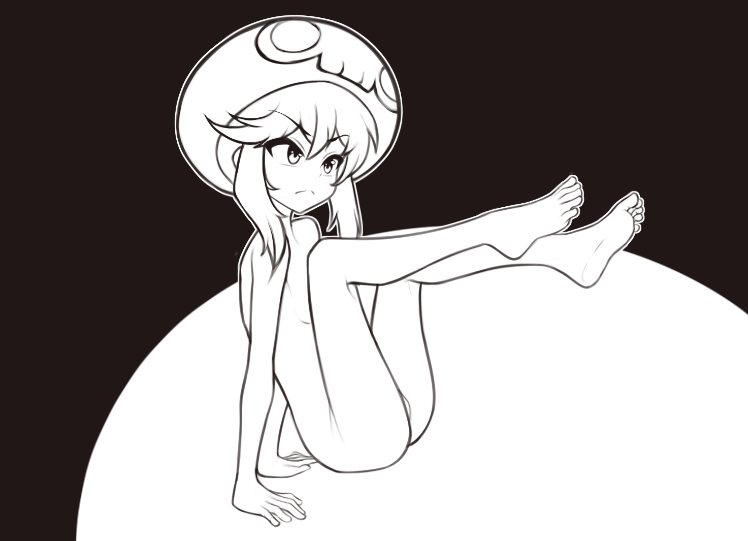 1girlassbarefootblack backgroundcompletely nudeflat chestfrom sidefrowngreyscalehatmonochromenudesidelockssolowhite background