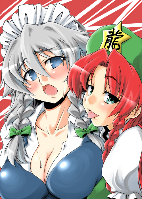 2girlsblue eyesblushbreastscleavagefemale focushairbandhatlarge breastslong hairmaidmultiple girlsred hairribbonshort hairyuri