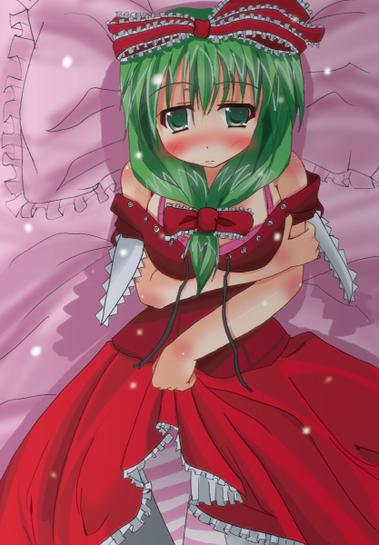 1girlblushbrabreastsdressfemale focusfrillsfront ponytailgreen eyesgreen hairlingerielyingmatching hair/eyeson backribbonsolounderwearundressing