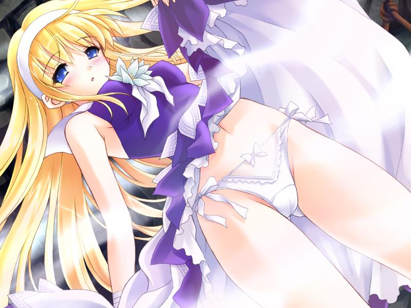 1girlblonde hairblue eyesclothes liftdressdress liftfemale focusfrillshairbandpantiespantyshotpurple skirtskirtsolounderwearupskirt