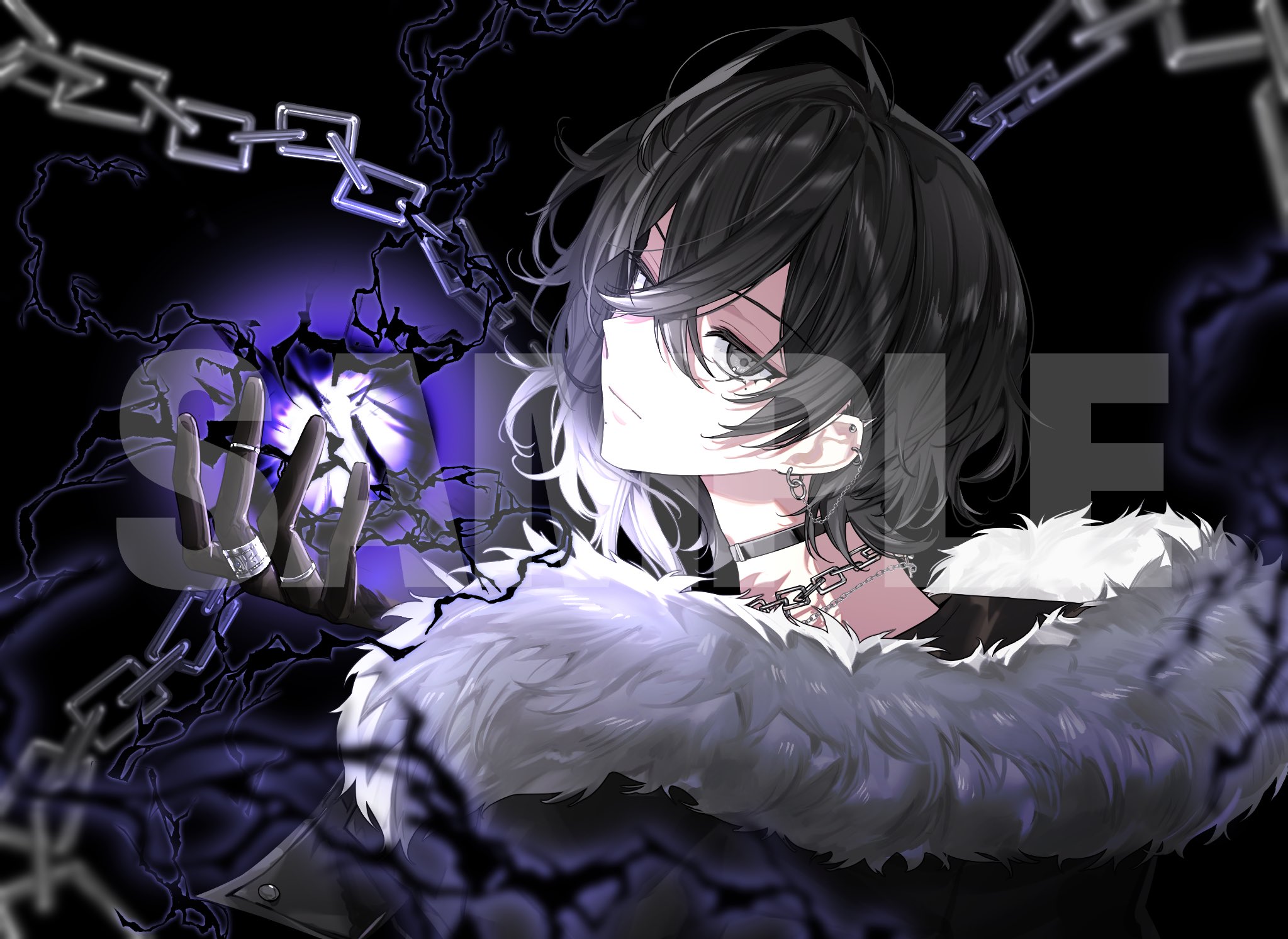1boyblack backgroundblack chokerblack eyesblack glovesblack hairblack jacketblushchainchain necklacechokerclosed mouthcrossed bangsdouble-parted bangsear piercingfur trimgloveshaime keihair between eyeshand upjacketjewelrylong hairlooking at viewermale focusnecklacepiercingportraitsample watermarksolovirtual youtuberwatermark