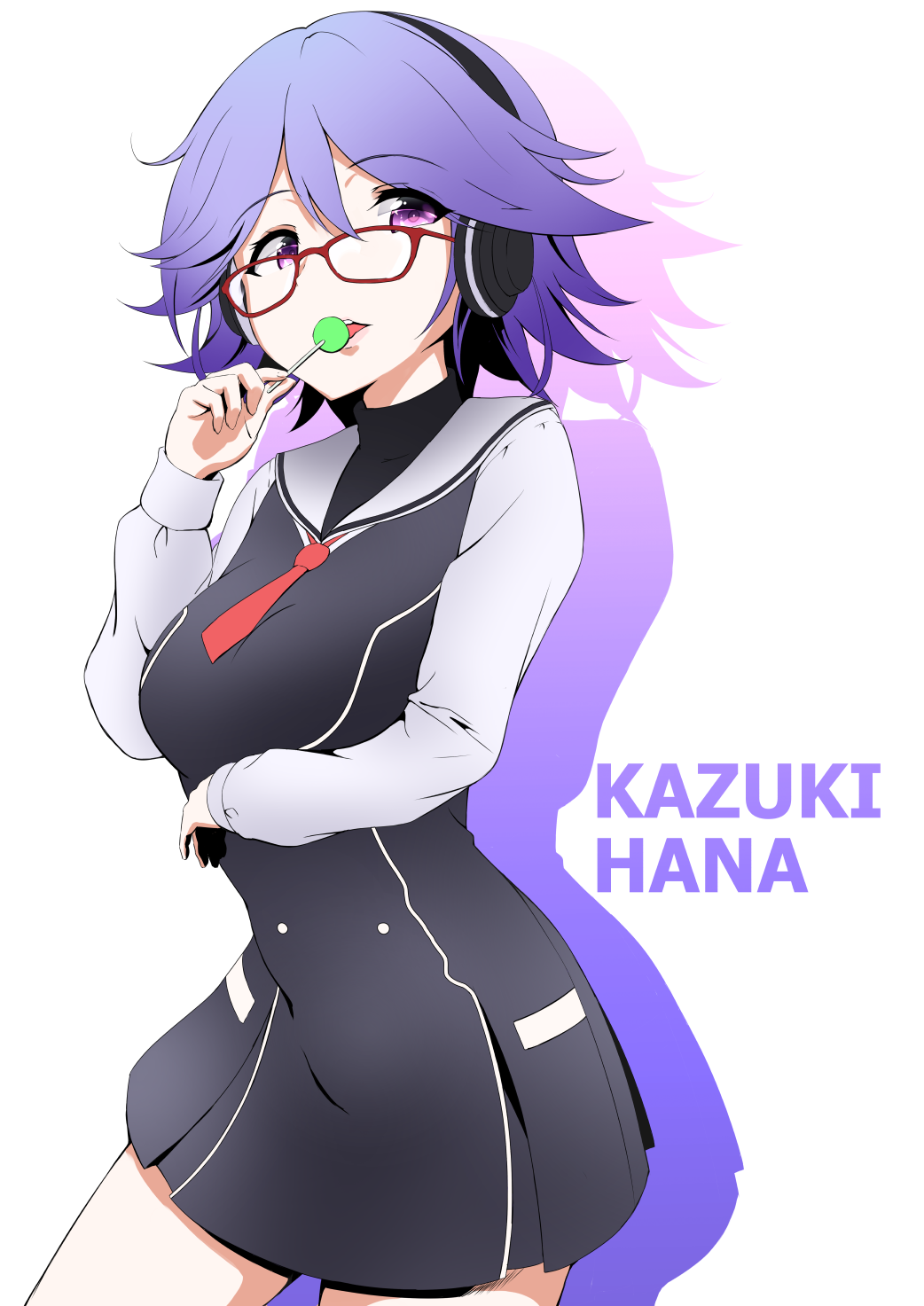 1girlblue hairblushbreastscandycharacter namecowboy shotdressfoodglasseshair between eyesheadphoneshekiho academy school uniformholdingholding candyholding foodholding lollipoplickinglollipoplong sleeveslooking at vieweropen mouthpurple eyesred-framed eyewearsailor collarschool uniformshort hairsimple backgroundsmilesolostandingtonguetongue outwhite background