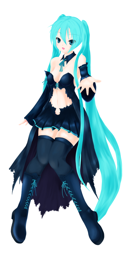 1girlaqua eyesaqua hairbootsbreastscleavagedetached sleevesfemale focusknee bootslong hairmedium breastsskirtsolothighhighstwintailsvery long hair
