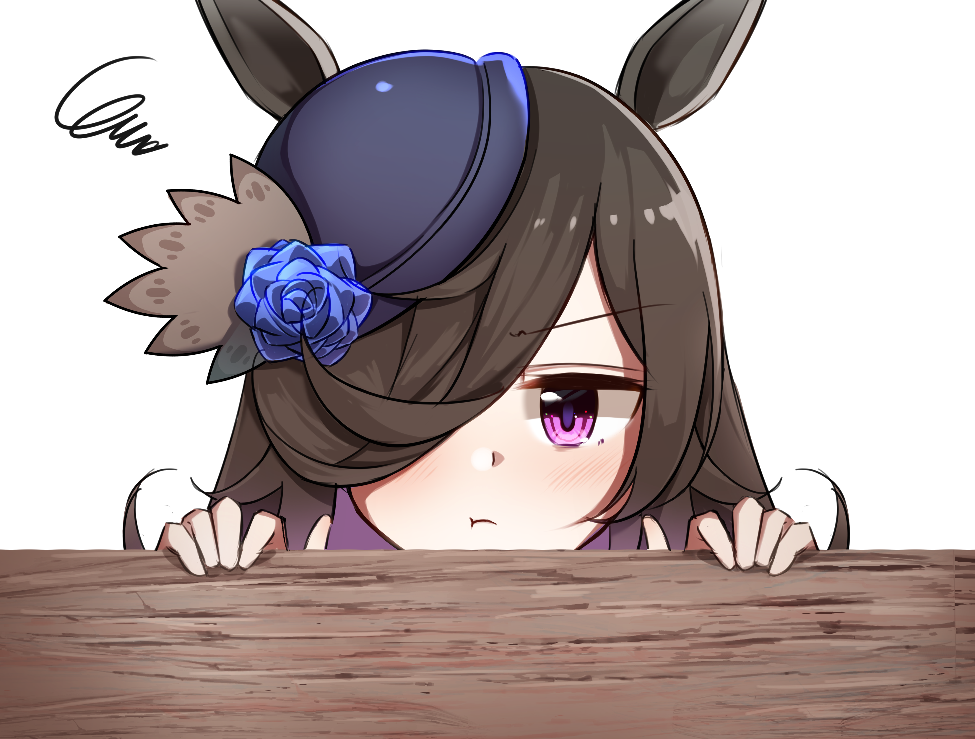 :t1girlanimal earsblack hairblue flowerblue roseblushflowerhair over one eyehathat flowerhorse earshorse girllong hairlooking at viewerone eye coveredpeekingpoutpurple eyespurple hatrosesolosquiggletilted headwearv-shaped eyebrowswhite background