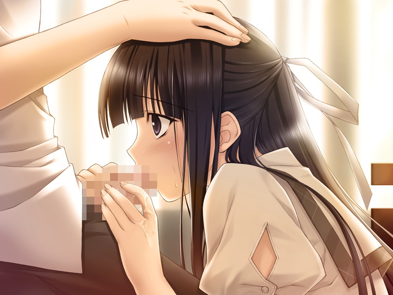 1girlbacklightingblack hairblushcensoredfellatiofrom sidehair ribbonhand on another's headlong hairmosaic censoringoralpenisprofileribbonschool uniformsolo focus