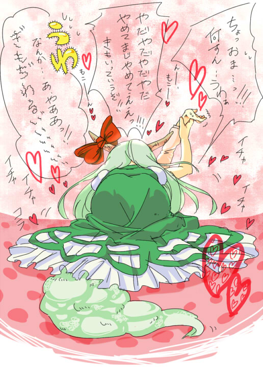 pop, hakurei reimu, touhou, 1girl, bobby socks, bow, breasts, brown eyes, brown hair, detached sleeves, dress, female focus, flat chest, frills, gohei, hair bow, hair tubes, looking back, no bra, red dress, shoes, short hair, sideboob, small breasts, smile, socks, solo, upskirt