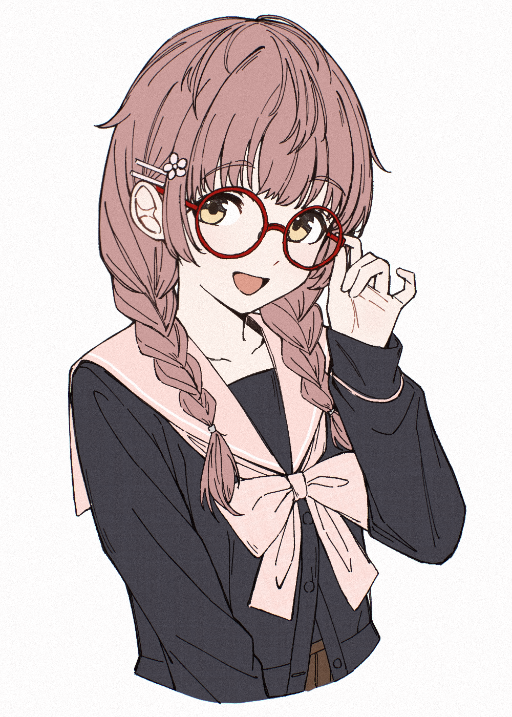 1girlbespectacledblack shirtbowbowtiebraidbrown haircollarbonecropped legsglasseslong hairlong sleeveslooking at viewerofficial alternate costumeofficial alternate hairstylered-framed eyewearround eyewearsailor collarschool uniformserafukushirtsimple backgroundsmilesolotwin braidsupper bodywhite backgroundwhite bowwhite bowtiewhite sailor collar