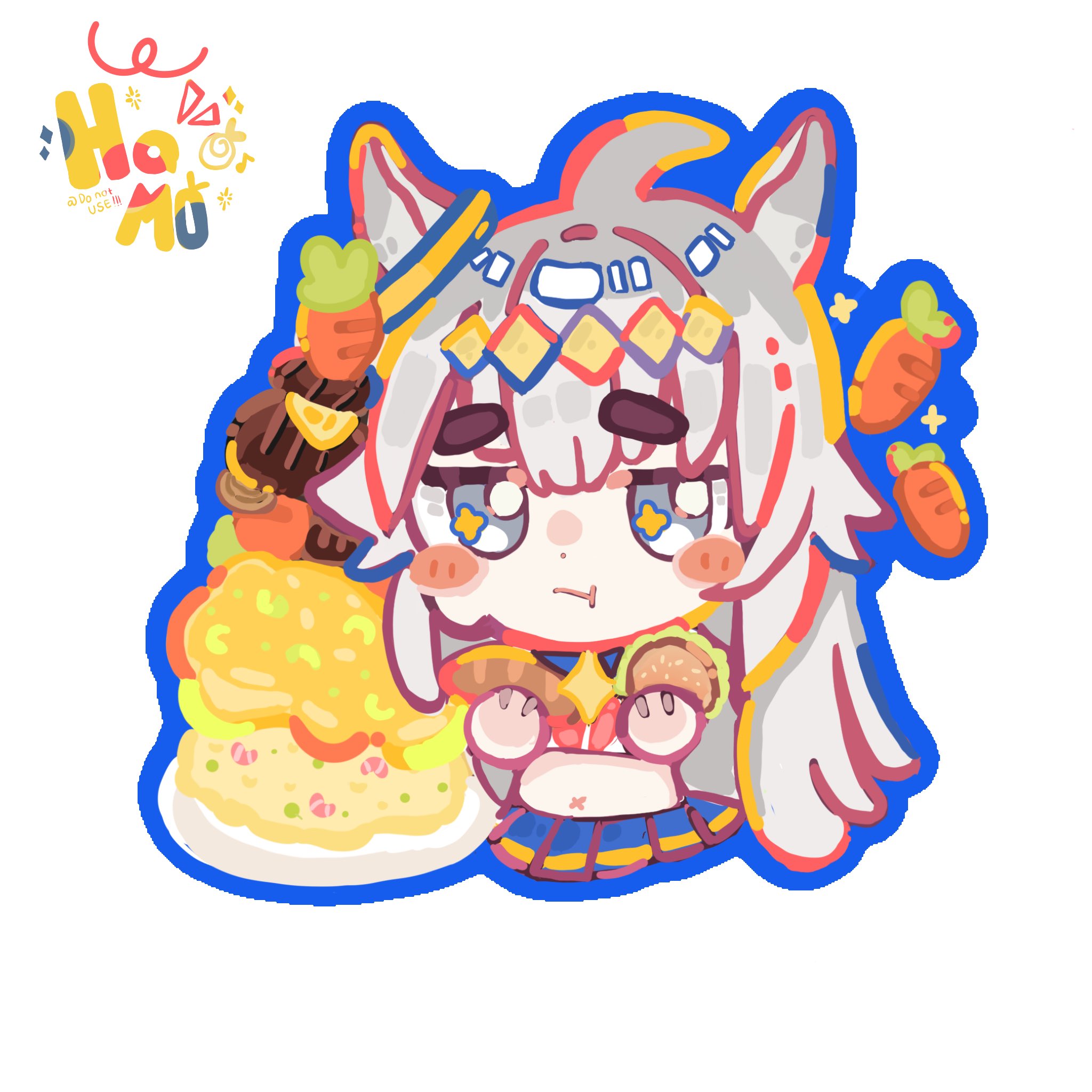 1girlahogeanimal earsbellybig bellyblue eyesblue sailor collarblue skirtblushblush stickersbreadbroochburgercarrotchibiclosed mouthcroissantear ornamenteatingfoodgluttongrey hairhair between eyeshair ornamenthairbandhamo8oholdingholding burgerholding foodhorse earshorse girljewelrylong hairlong sleevesmulticolored hairnavelneckerchiefpleated skirtred neckerchiefsailor collarshirtskirtsolostar broochwhite shirt