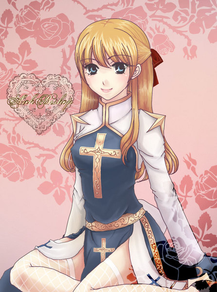 moai (aoh), victorica de blois, gosick, bad id, bad pixiv id, 1girl, blonde hair, bonnet, female focus, flower, green eyes, hat, high heels, holding, holding smoking pipe, long hair, pink shoes, rose, shoes, sitting, smoking pipe, solo, victorian