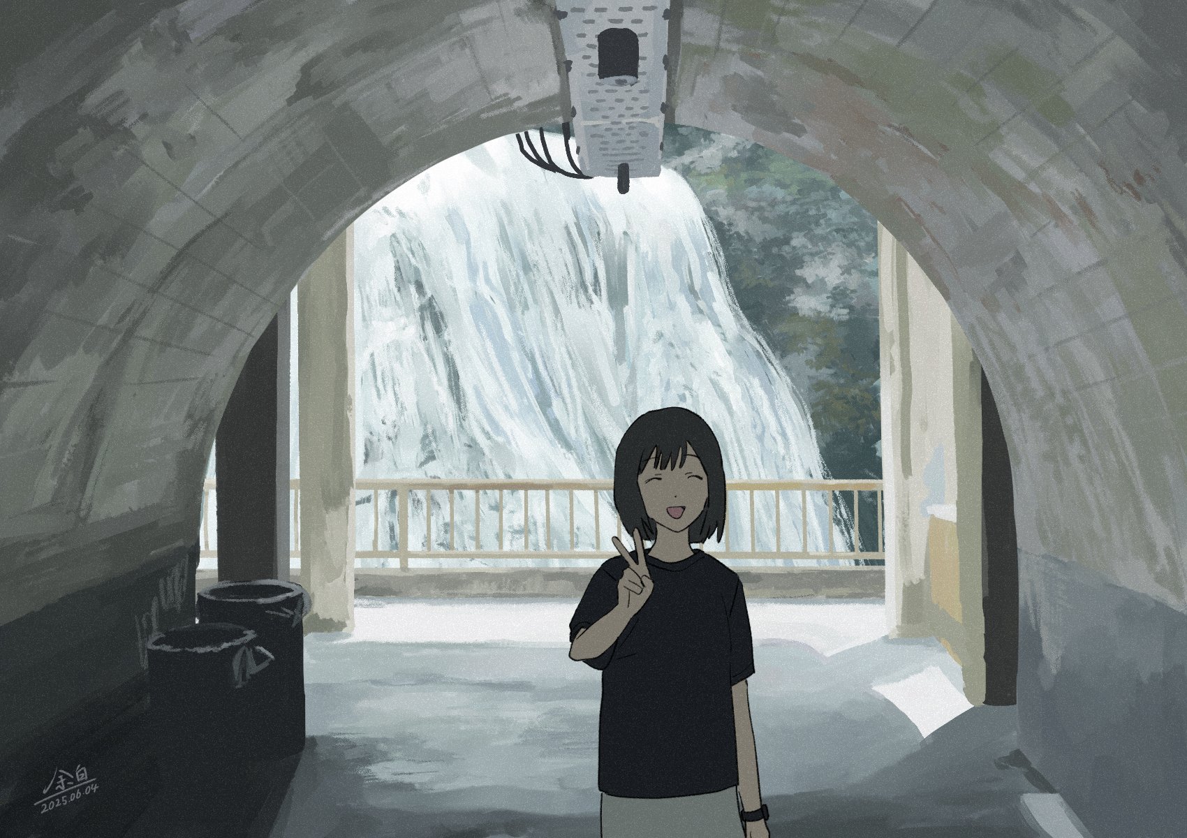:d1girlblack hairblack shirtceiling lightclosed eyesdateddot noseopen mouthrailingreal world locationshirtshort hairshort sleevessmilesolot-shirttrash cantunnelvwatchwaterwaterfallwristwatch