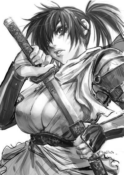 1girlarmorbreastscleavagefemale focusfighting stancegreyscalehair over one eyejapanese armorjapanese clotheskatanakimonokotelarge breastslipsmonochromeninjano braponytailsashscarfsheathshort hairshort kimonosimple backgroundsketchsoloswordtorn clothesunsheathingupper bodyweapon