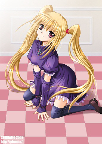 1girlblonde hairdetached sleevesfemale focuskneelinglong hairred eyessolothighhighstwintailsvery long hair