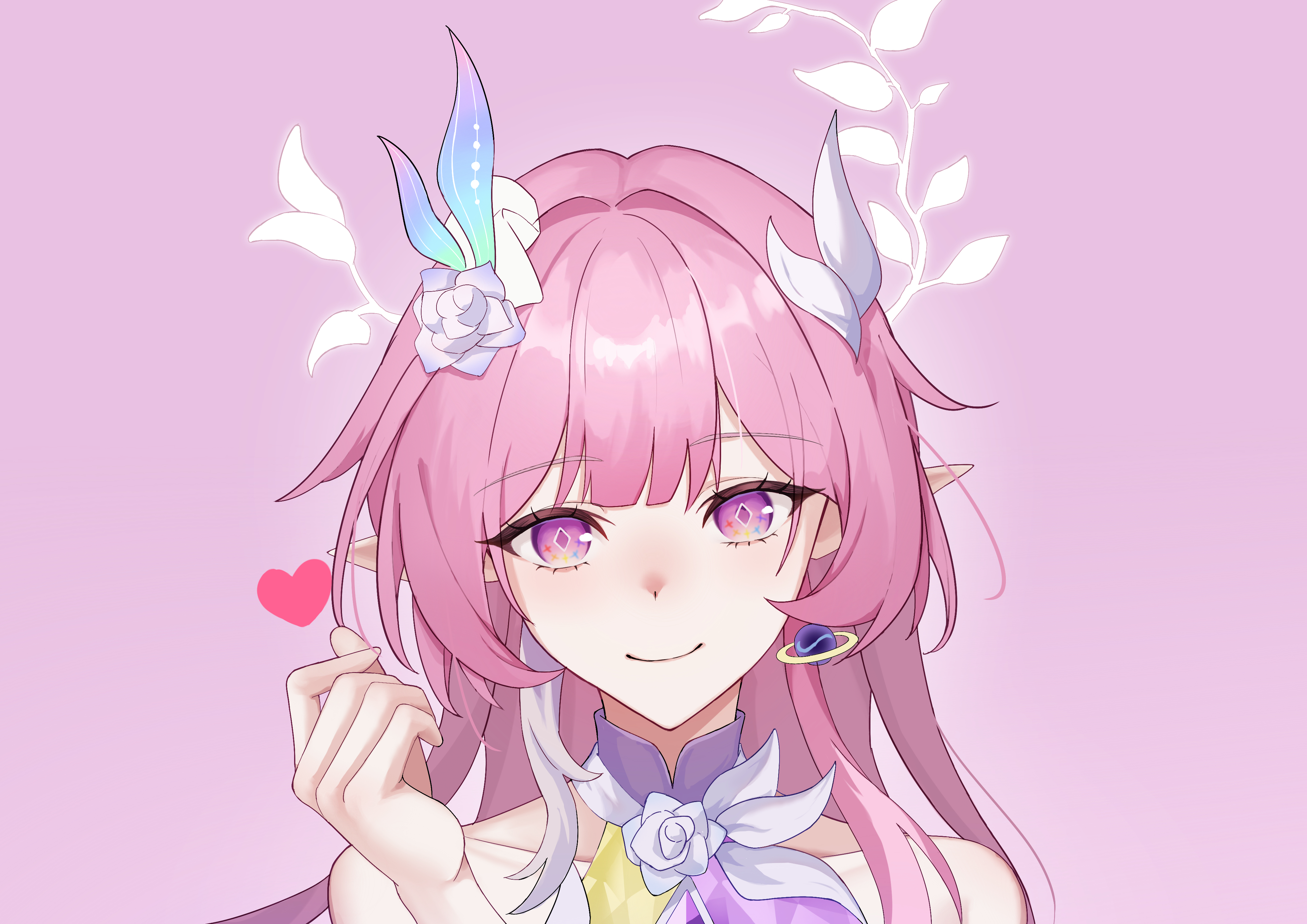 1girlbare shouldersdiamond (shape)diamond-shaped pupilsearringsflowerhair flowerhair ornamenthaloheartjewelrylong hairlooking at viewermulticolored hairmurasakinoapink backgroundpink hairpointy earspurple eyessimple backgroundsmilesolosymbol-shaped pupilstwo-tone hairupper bodyvery long hairwhite hair