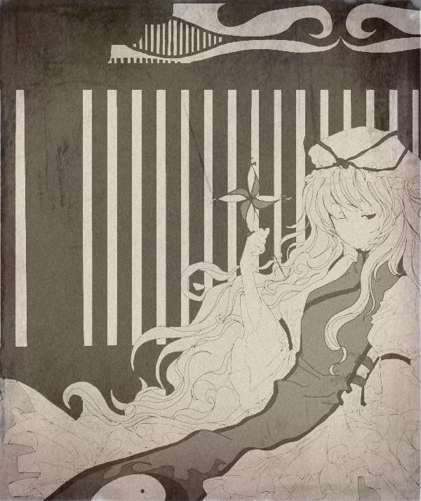ukyo rst, konpaku youmu, yakumo ran, touhou, silver hair, highres, 2girls, animal ears, biting, blonde hair, blue eyes, blush, chain, cuffs, female focus, fox ears, fox tail, handcuffs, hat, heart, multiple girls, multiple tails, open mouth, ribbon, saliva, short hair, tail, tears, wide sleeves, wince, wink, yuri