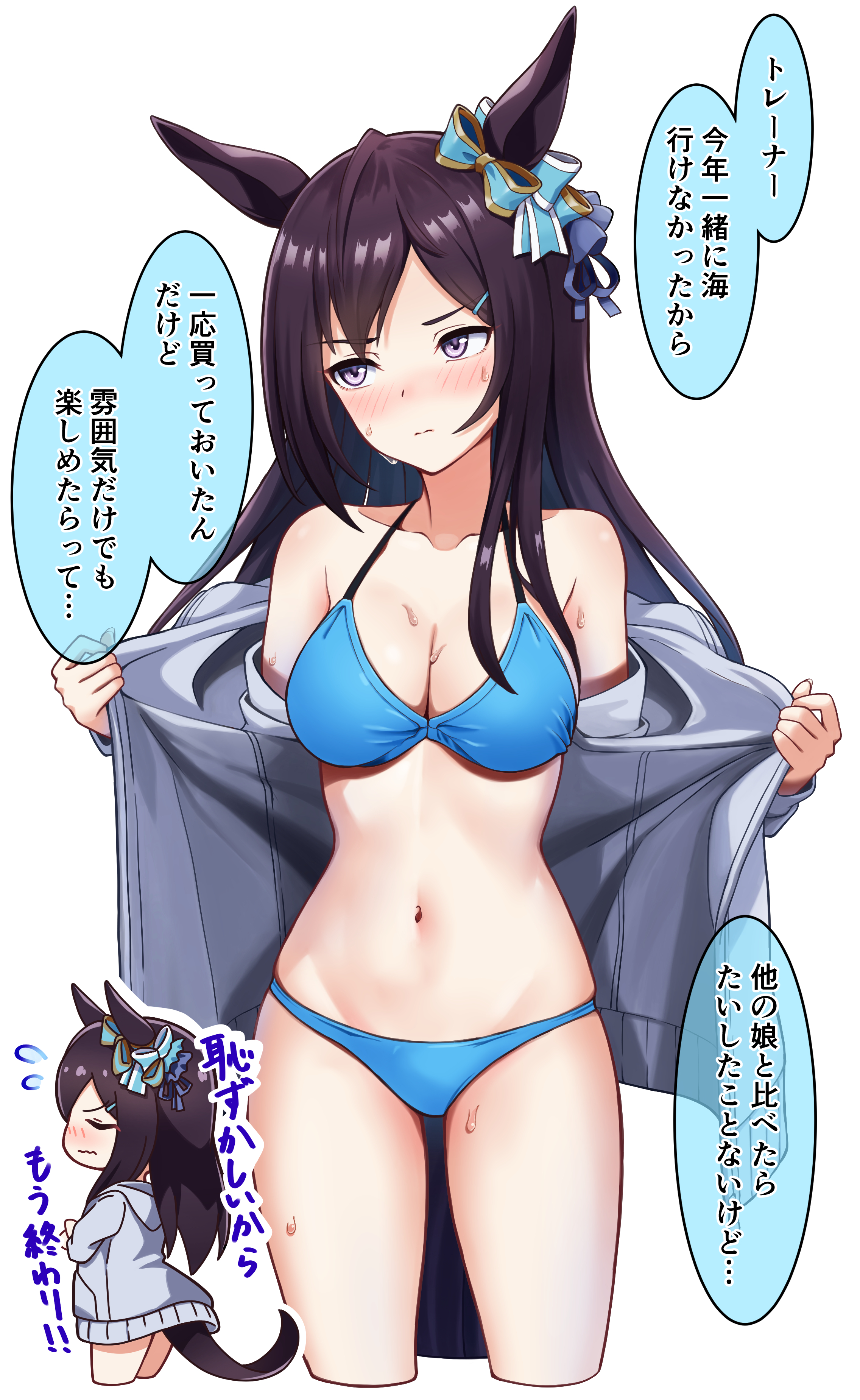 1girlanimal earsbikiniblack hairblue bikiniblue bowblushbowbreastscleavageclosed mouthcollarbonecowboy shotear bowflying sweatdropsgrey jackethorse earshorse girlhorse tailjacketlong hairlong sleevesmedium breastsmultiple viewsnavelpurple eyessimple backgroundspeech bubblestomachsweatswimsuittailwhite background
