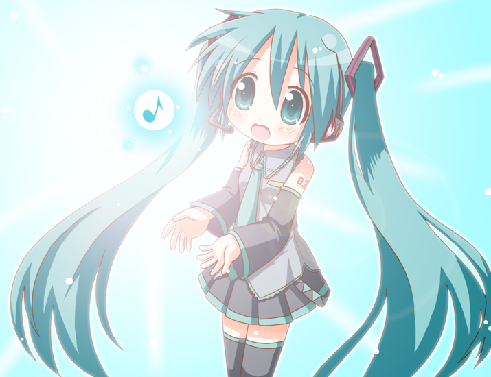 aqua eyesaqua hairdetached sleeveslong hairmicrophonenecktieskirtsolothighhighstwintailszettai ryouiki