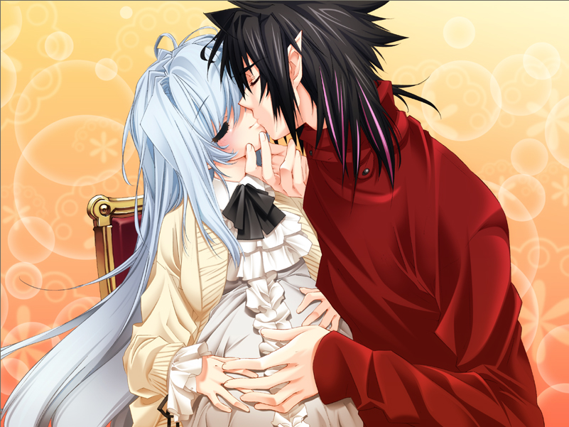 1boy1girlblack hairblushchairclosed eyescoupleheterokisslong hairpregnantsittingvery long hairwhite hair