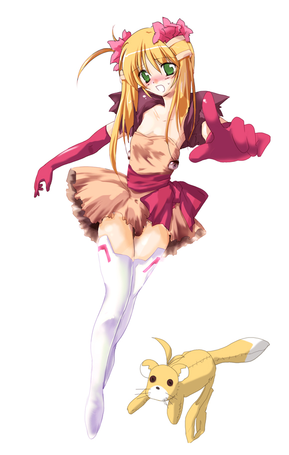 oza watto, original, 1girl, all fours, animal ears, arm support, blush, brown eyes, brown hair, female focus, flat chest, glasses, looking at viewer, nude, short hair, simple background, solo, thighhighs