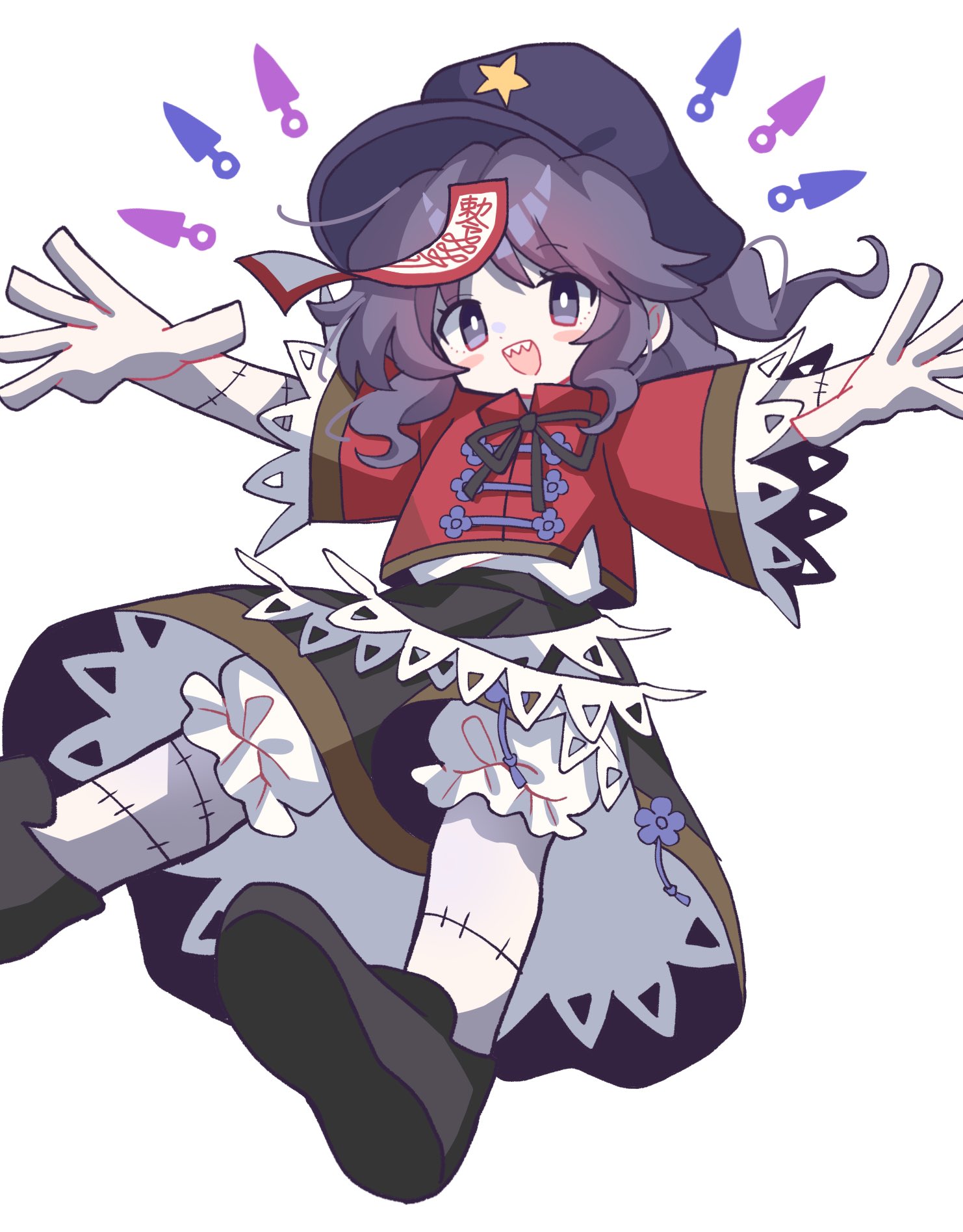 1girlblue skirtbootschinese clothesdetached sleevesfangflowerfrillshair flowerhair ornamenthatjiangshiopen mouthoutstretched armspurple hairred eyesshort hairsimple backgroundskirtstitchestalismanthighhighswhite background