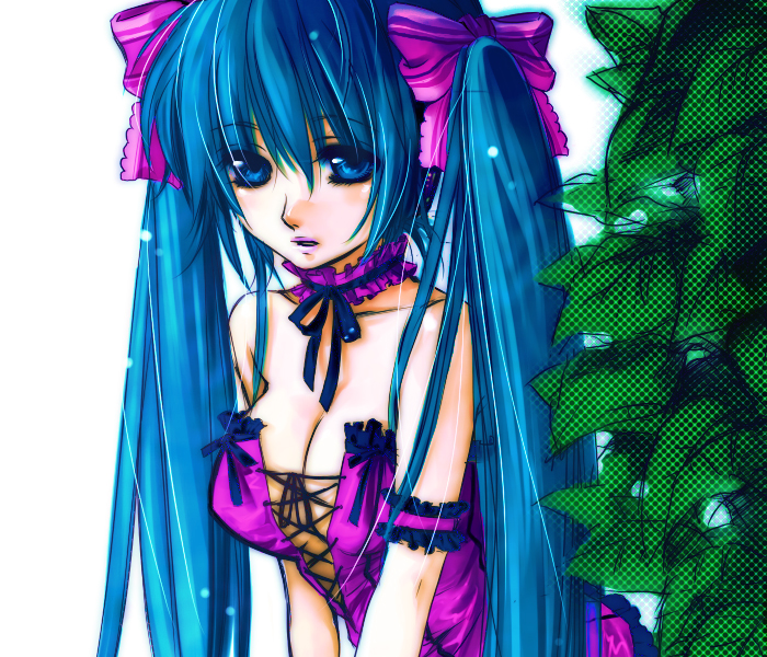 1girlblue eyesblue hairbreastschokercleavagefemale focushair ribbonlarge breastslong hairmatching hair/eyesribbonsolotwintails