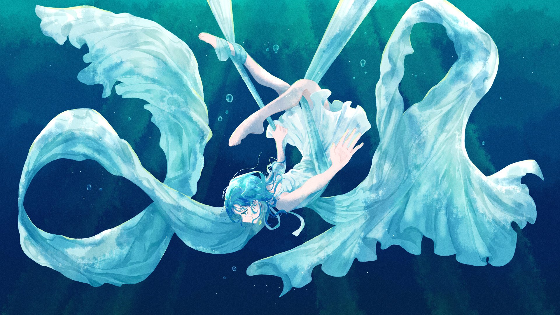 1girlbarefootbubbledressfloating hairfrom sidemedium hairscarfsleevelesssolounderwaterupside-downwhite dresswhite scarf