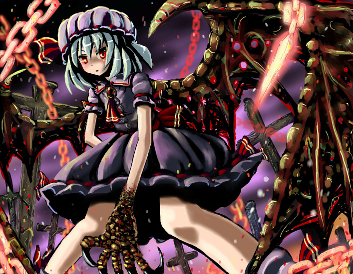 enishi midori, patchouli knowledge, touhou, 1girl, collar, crescent, crescent hair ornament, dress, expressionless, female focus, frilled collar, frilled shirt collar, frills, hair ornament, hair over one eye, long sleeves, looking at viewer, purple dress, purple eyes, purple hair, solo