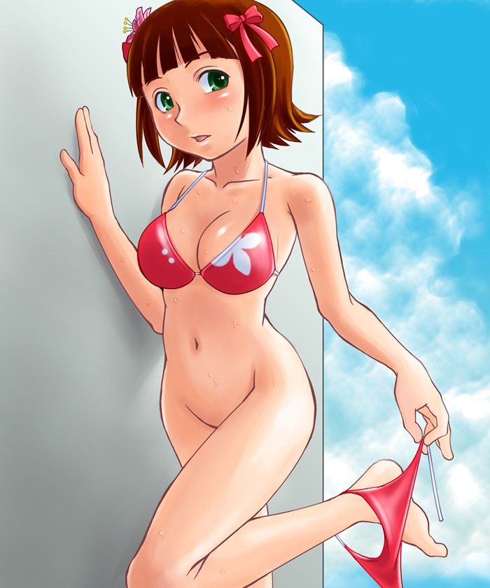 yoko littner, tengen toppa gurren lagann, translation request, 00s, 1girl, ass, bikini, bikini top only, breasts, female focus, fingerless gloves, gloves, kneeling, legs, ponytail, pussy, red hair, solo, swimsuit, thighhighs, uncensored, undressing, white background, yellow eyes