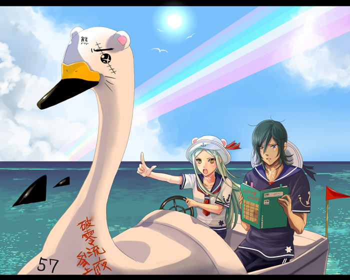 chuujou kagetsu, polaris (shinrabanshou), shinrabanshou, 1girl, armor, blue background, blue gloves, blue theme, bow, expressionless, female focus, gloves, green hair, hair bow, huge weapon, long hair, looking at viewer, ponytail, red eyes, sidelocks, skirt, solo, weapon, white bow