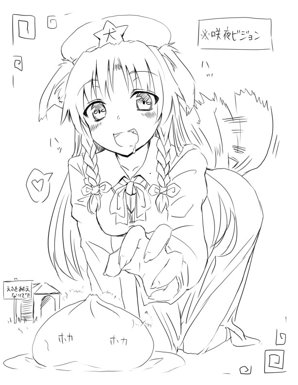 1girlanimal earsbraiddog earsfemale focusgreyscalehatmonochromesalivasolotwin braidswhite background