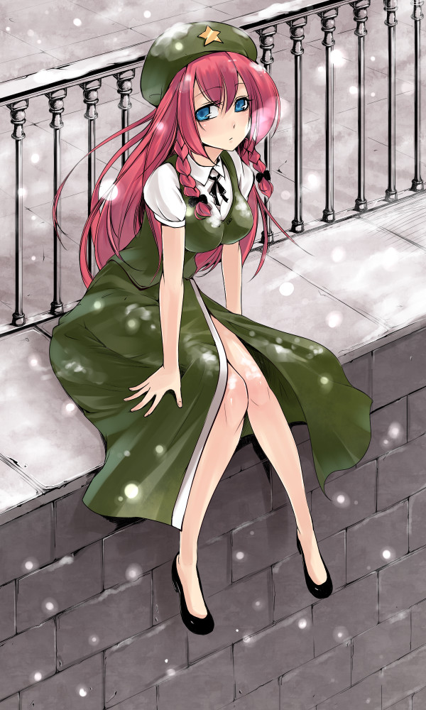 1girlblue eyesbraidbreastschina dresschinese clothesdressfemale focusfull bodyhatlong hairoutdoorsred hairsittingsnowsolotwin braids