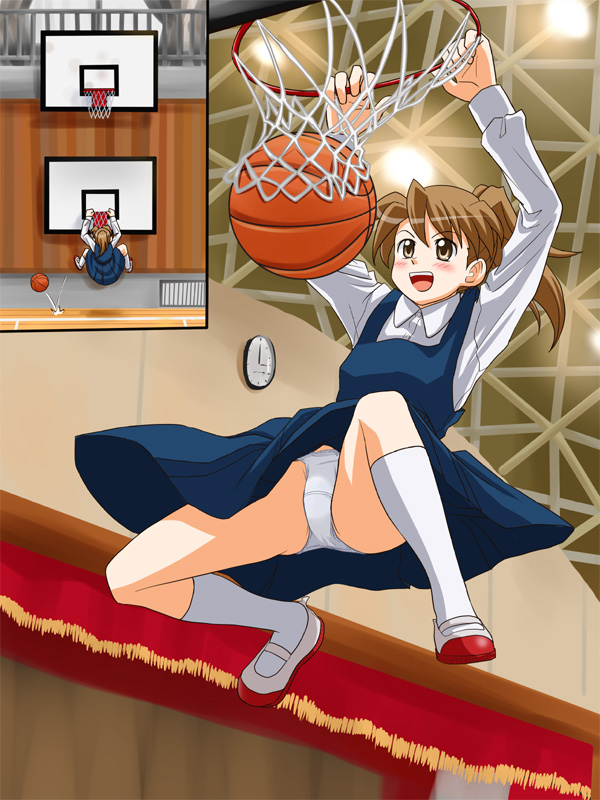 toshifumi, toudou shimako, maria-sama ga miteru, 00s, 1girl, arms behind back, blush, breasts, brown eyes, brown hair, female focus, hat, kindergarten, kindergarten uniform, large breasts, long hair, looking at viewer, maria sama, midriff, name tag, navel, pleated skirt, school hat, shirt, skirt, solo, taut clothes, taut shirt, undersized clothes