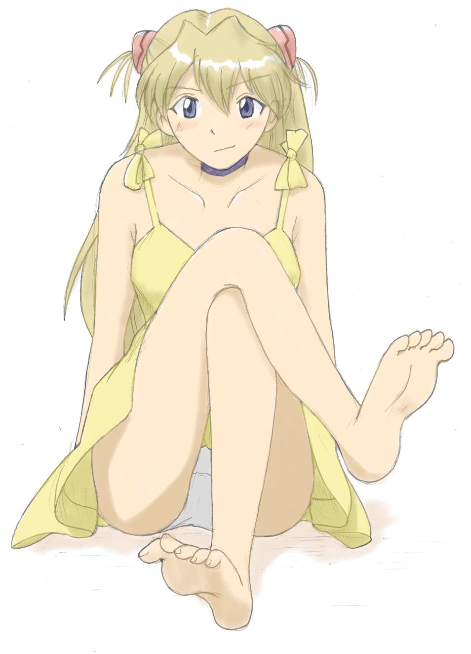 1girlbad anatomybad feetbarefootdressfeetfemale focuslegslong hairpantiespoorly drawnsmilesolessolotoe scrunchtoesunderwearupskirtwhite pantiesyellow dress