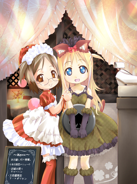 animal earsblonde hairblue eyesbrown eyesbrown haircat earschildchristmaselbow glovesglassesgloveshatsanta hattraywaitress