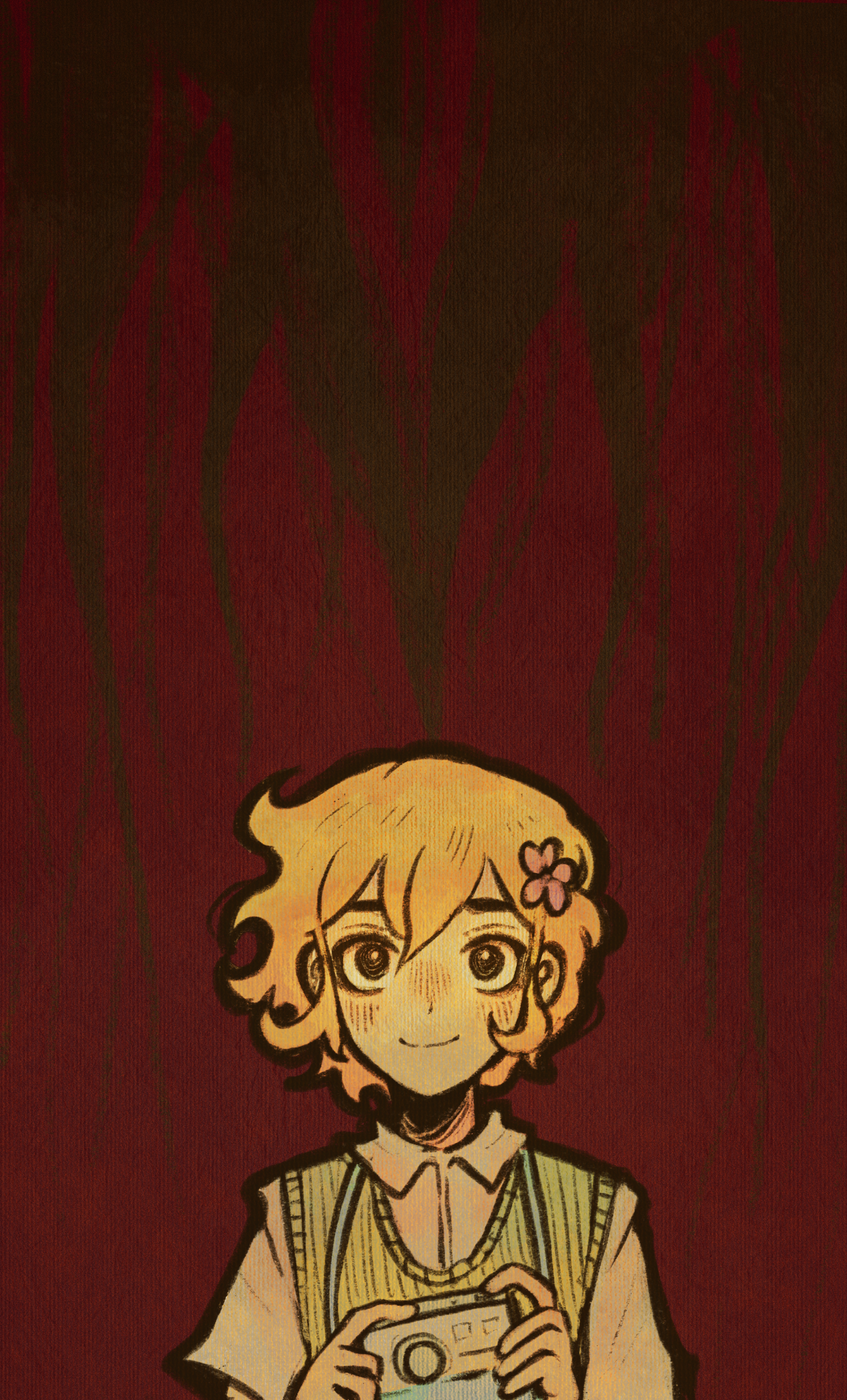 1boyalternate eye colorblack eyesblonde hairblushcameraclosed mouthcollared shirtdouble-parted bangsflowergreen sweater vesthair flowerhair ornamentholdingholding cameralooking at viewermale focusshirtshort hairshort sleevessidelockssmilesolosweater vestupper bodywhite shirt